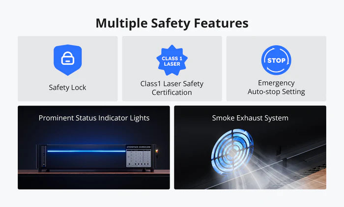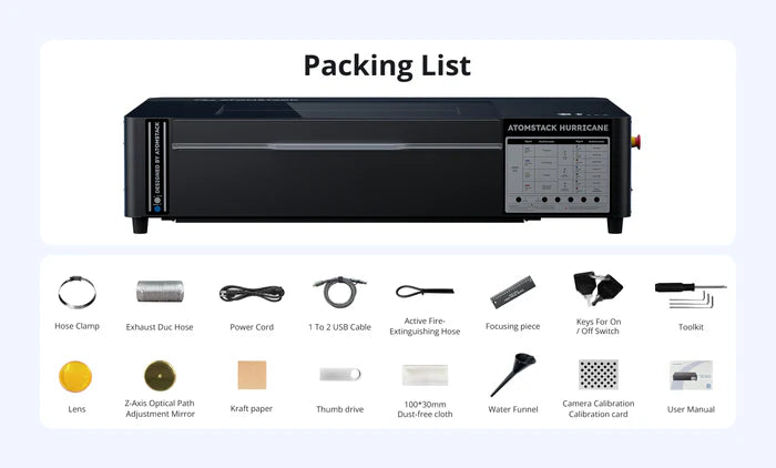 Unleash your creativity with the AtomStack Hurricane, a powerhouse 55W CO2 laser engraver engineered for speed, precision, and versatility. Designed to cut and engrave on wood, acrylic, leather, glass, coated metals, and plastics, the Hurricane achieves up to 600mm/s engraving speed with 0.01mm accuracy—delivering crisp, professional results every time. Its fully enclosed Class 1 safety design, built-in fire extinguisher, and emergency stop system ensure complete peace of mind. With a 19.6" × 11.8" base area, expandable up to 31.5", plus smart tools like a 5MP camera, autofocus, and LightBurn compatibility, the Hurricane is your all-in-one solution for precision engraving and efficient workflow.