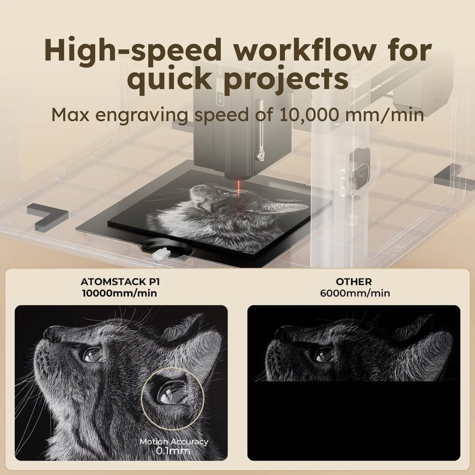 The AtomStack P1 works faster than similar laser engravers. Get results in no time. No one wants to wait minutes before they see the results. Most designs are ready after 10-15 seconds. More complex designs can take longer.