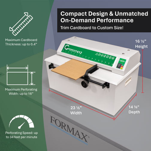 The Greenwave 412 perforates cardboard at up to 34 feet per minute, up to 16” wide, and up to 0.4” thick. It can reduce the cost of purchasing shipping materials and waste hauling, while upgrading packaging material to a high-quality, sustainable alternative to single-use plastic and foam packing products.