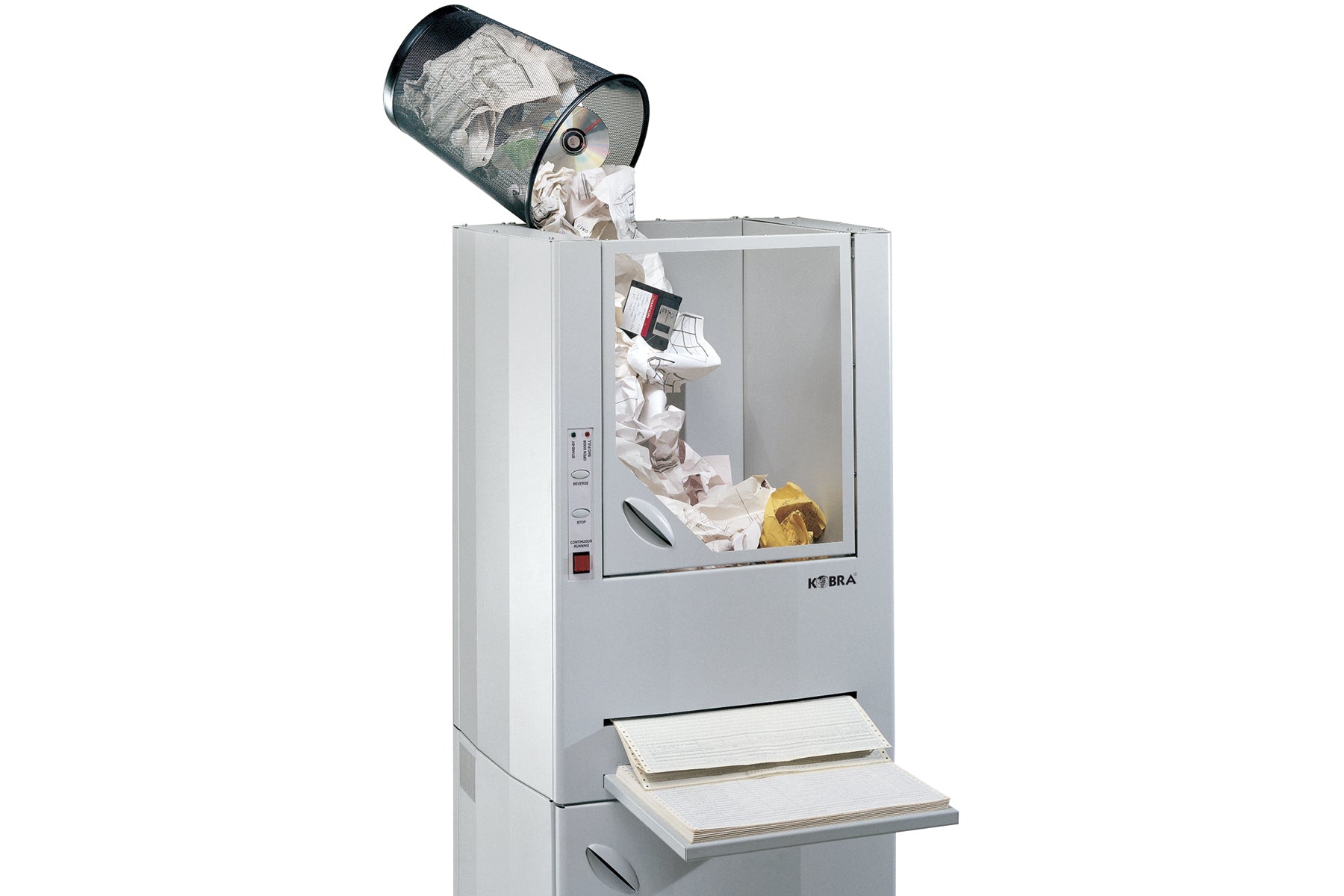 The KOBRA 400 C2 is a centralized cross-cut shredder built for heavy office use, designed to handle both computer printouts and mixed paper waste from multiple workstations. Simply insert paper through the dedicated throat or empty bins into its large hopper—the automatic feeding system with revolving flaps ensures efficient shredding into small, secure cross-cut chips.