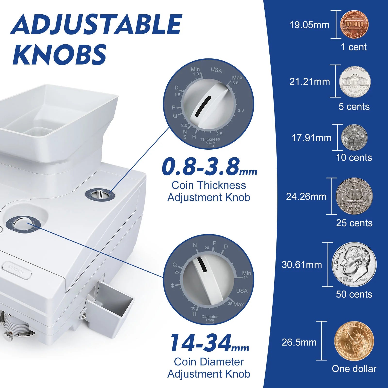 - Counts all US, Canadian, Mexican, other foreign coins and tokens thickness within 1.0-4.0mm, diameter within 14-33mm. Counting speed: 2300 coins/min (for coins with a diameter of 15mm and thickness of 1mm)